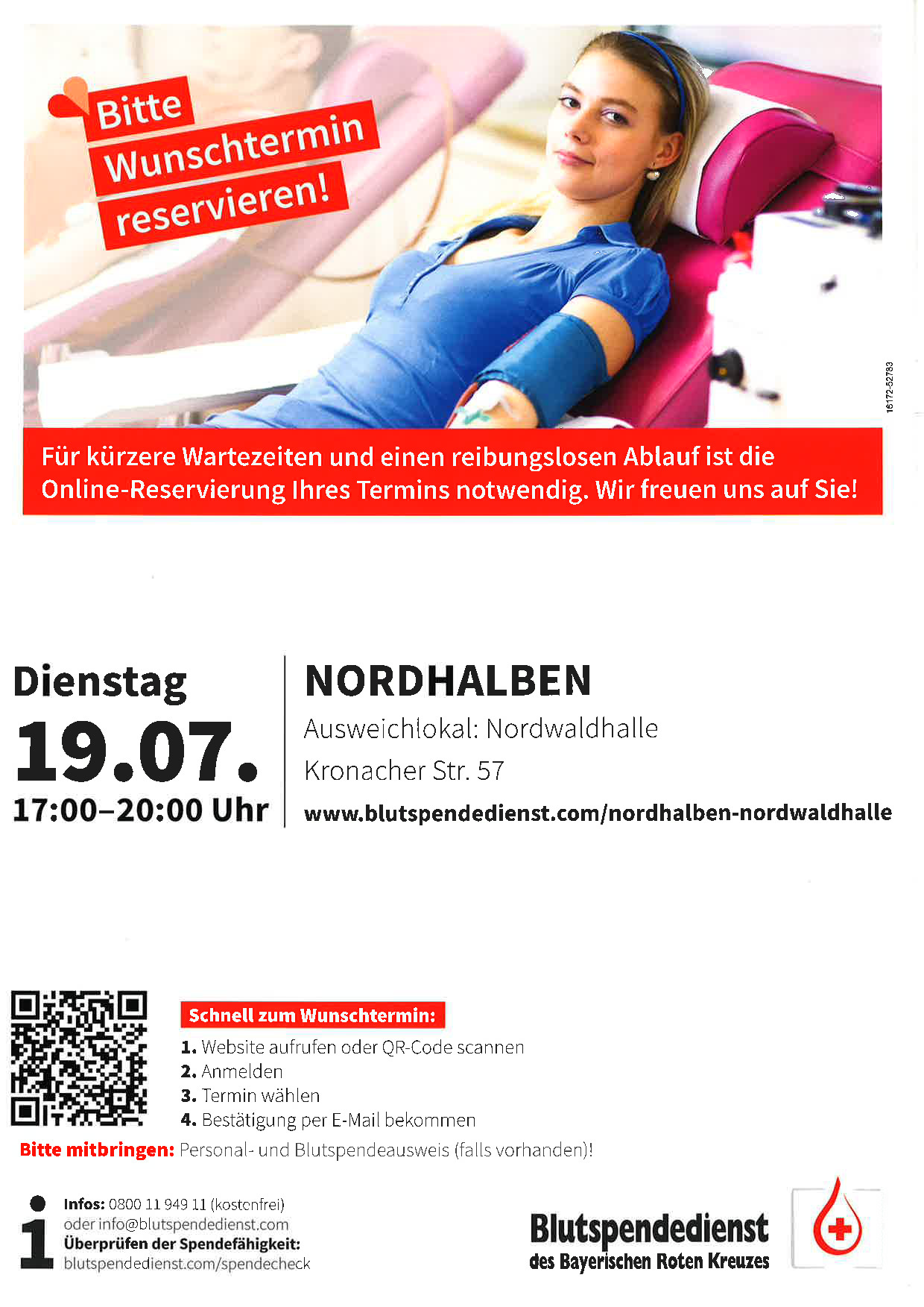 Am Dienstag, den 19.07.2022 von 17:00 bis 20:00 Uhr ist Blutspenden in Nordhalben.