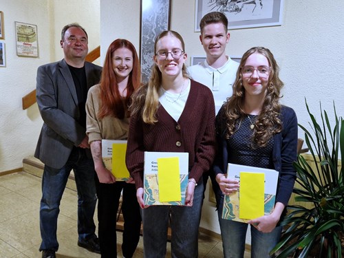 Ehrungen Absolventen: Bürgermeister Michael Pöhnlein (li) ist stolz darauf, dass das kleine Nordhalben so viele sehr gute Absolventen beglückwünschen kann. Von links Alessa Wolf, Stella Wachter, Nicolai Wunder und Lena Kürschner. Foto: Susanne Deuerling