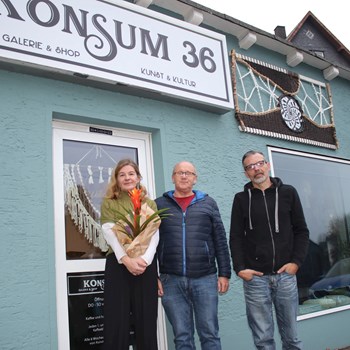 Die Marktgemeinde Nordhalben gratuliert dem Ehepaar Deckelmann zur Eröffnung ihrer Galerie und Cafés „Konsum 36“ in den renovierten Räumen des ehemaligen Getränkehandels in der Kronacher Straße 36.