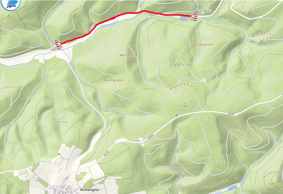 Wie uns das Landratsamt Kronach mitteilte, ist im Zeitraum vom 24.02.2025 bis 31.03.2025 die Gemeindeverbindungsstraße zur Langenau zwischen Langenau (Forsthaus) und der Abzweigung nach Wolfersgrün aufgrund von Baumfällarbeiten komplett gesperrt (siehe nebenstehende Abbildung).