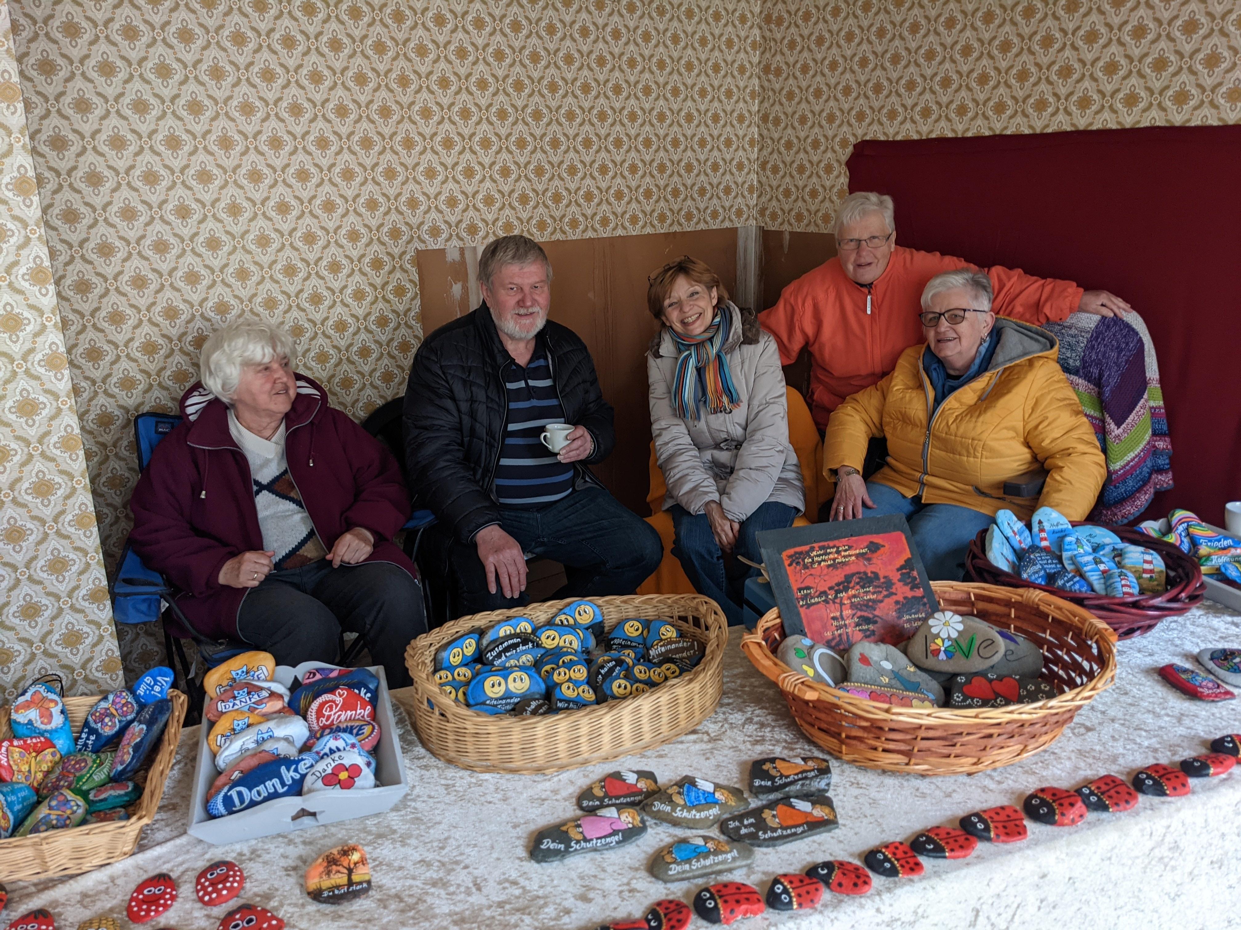 Die VHS-Malergruppe um Leiterin Frau Dagmar Hänel hat in vielen Stunden Steine mit verschiedenen Motiven bemalt, welche am letzten Sonntag in der Daumskurve zum Verkauf angeboten wurden.