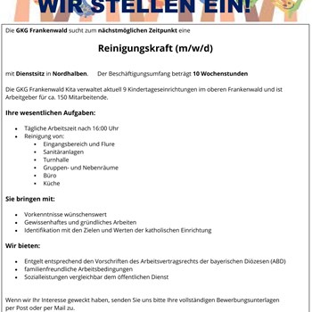 Die GKG Frankenwald sucht zum nächstmöglichen Zeitpunkt eine Reinigungskraft (m/w/d) mit Dienstsitz in Nordhalben.