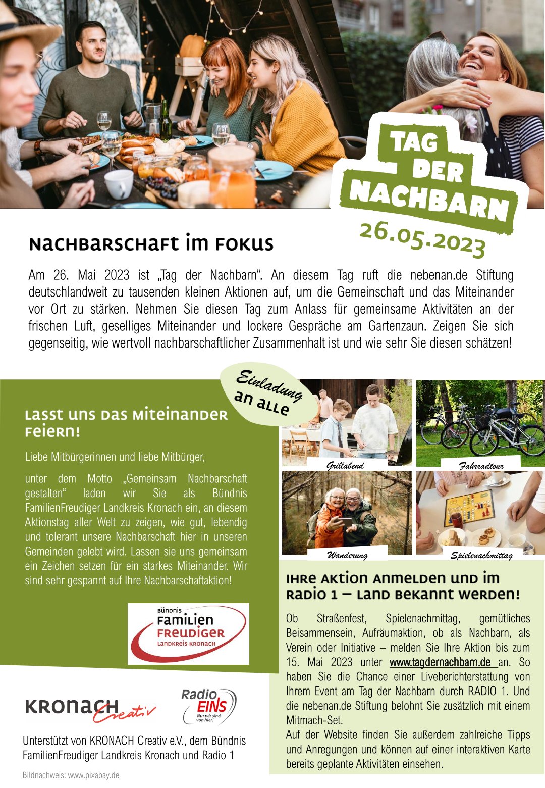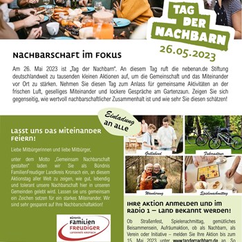 Wer sich dazu entschließt mit seiner Nachbarschaft eine schöne Zeit zu verbringen, sollte dies unbedingt ab dem 28. März unter www.tagdernachbarn.de anmelden! Denn jede gemeinschaftliche Aktion – egal ob klein oder groß – wird mit einem Mitmach-Set, welches vorab zugeschickt wird, belohnt. Gleichzeitig können Sie auf einer interaktiven Karte erfahren, welche Aktivitäten innerhalb der Gemeinde bereits geplant werden.