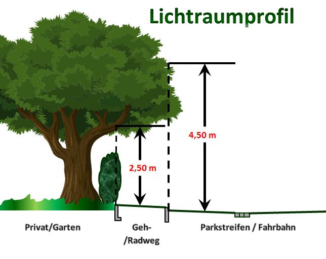 Über Geh- und Radwegen sowie Fahrbahnen muss das sogenannte „Lichtraumprofil“ freigehalten werden. Als „Lichtraumprofil“ wird eine festgelegte Umgrenzungslinie bezeichnet, die über dem Fahrweg freigehalten werden muss. Aus Gründen der Sicherheit und Leichtigkeit des Verkehrs muss das Lichtraumprofil der öffentlichen Verkehrsflächen frei und sauber gehalten werden.