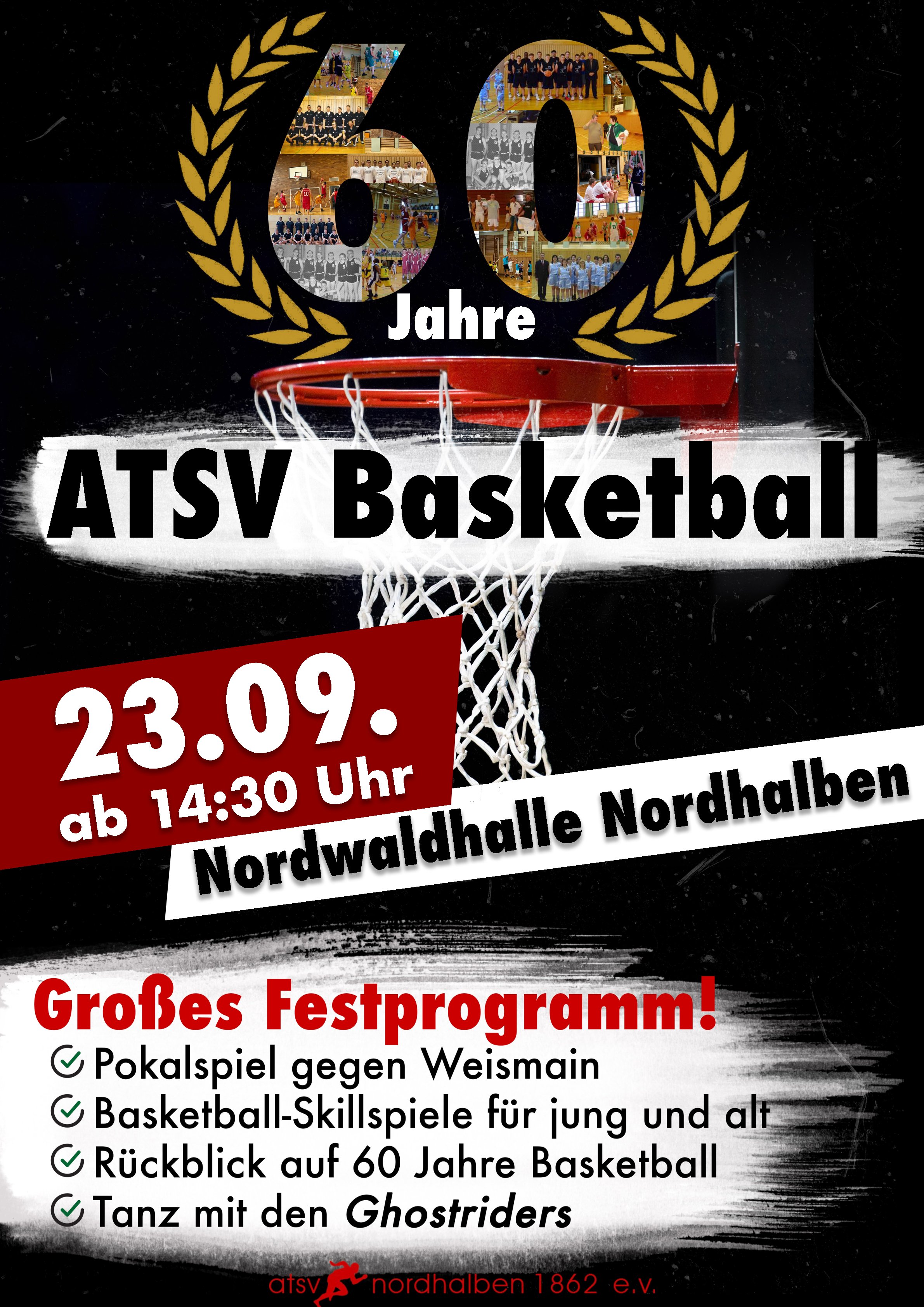 Am Samstag, den 23.09.2023 feiert die Basketballabteilung des ATSV ihr 60-jähriges bestehen. Am Nachmittag sind verschiedene Rahmenprogrammpunkte geplant und am Abend findet ein Tanz der Generationen mit den "Ghostriders" statt.