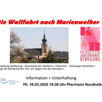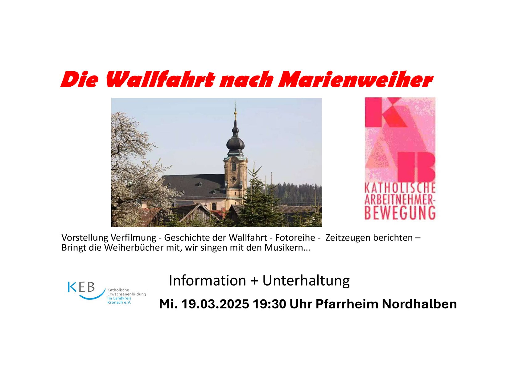 Am Mittwoch, den 19.03.2025 findet im Kath. Pfarrheim unter dem Namen "Die Wallfahrt nach Marienweiher" ein Unterhaltungs-/Informationsabend mit verschiedenen Programmpunkten wie Vorstellung Verfilmung - Geschichte der Wallfahrt - Fotoreihe - Zeitzeugen berichten – Bringt die Weiherbücher mit, wir singen mit den Musikern… statt.