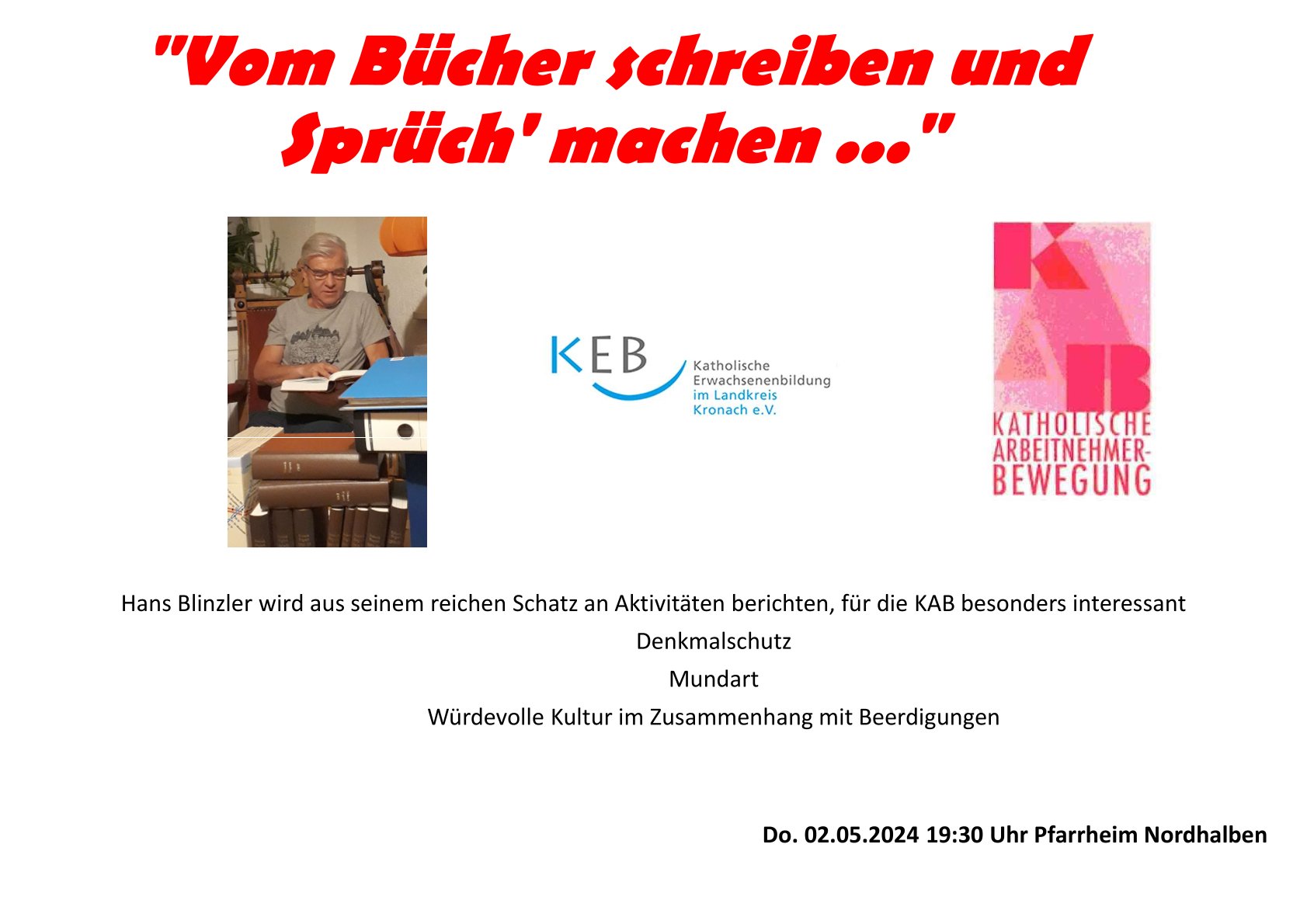 Erwachsenenbildungstermin KEB "Vom Bücher schreiben und Sprüch' machen ..." Am Donnerstag, den 02.05.2024 findet der Erwachsenenbildungstermin KEB "Vom Bücher schreiben und Sprüch' machen ..." im Pfarrheim Nordhalben statt. Diese Veranstaltung im iCal-Format speichern plakat (1).jpg 02.05.2024 19:30 Uhr Kath. Pfarrheim Kronacher Straße 14a 96365 Nordhalben KAB Nordhalben Allgemein