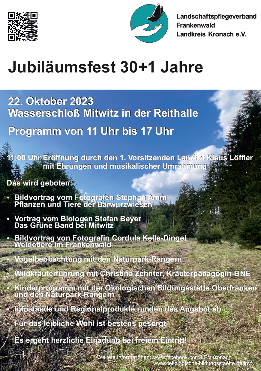 Am Sonntag, den 22.10.2023 findet das Jubiläumsfest des Landschaftspflegeverbandes Frankenwald Lkr. Kronach e.V. in der Reithalle im Wasserschloss Mitwitz statt.