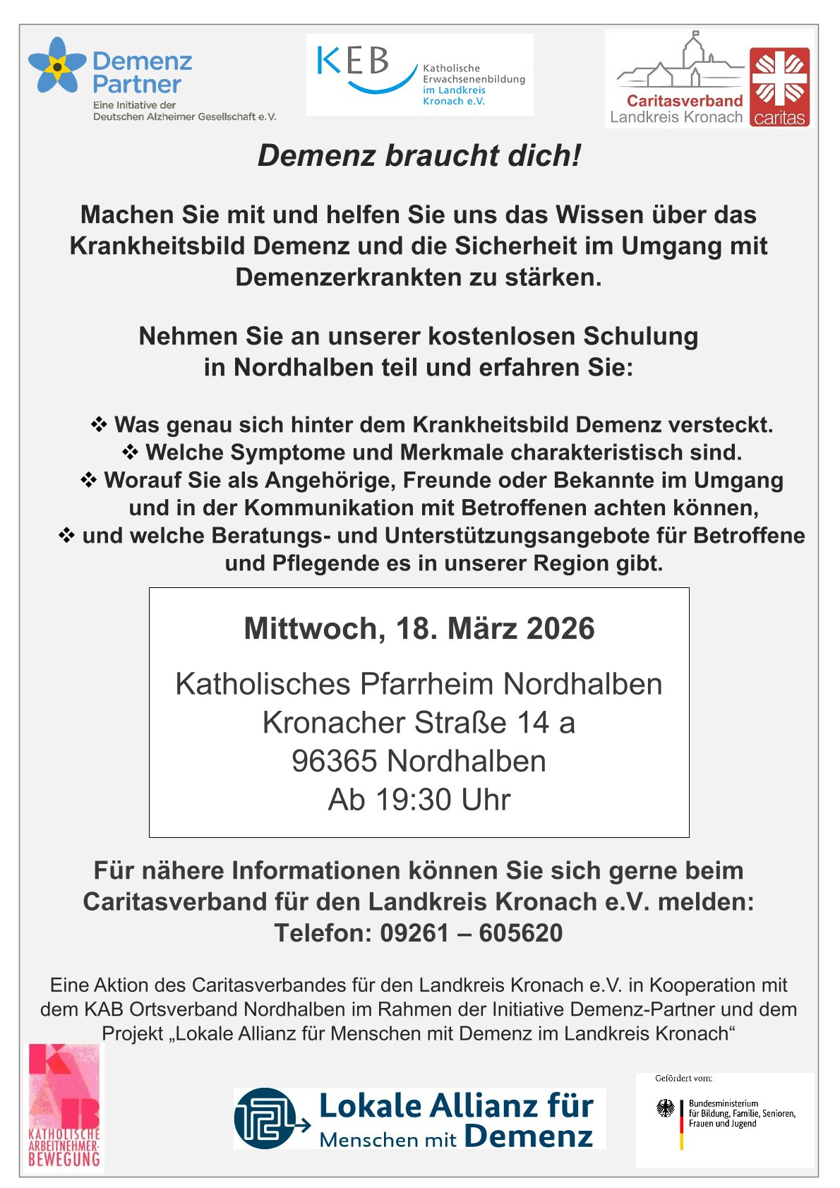 Am Mittwoch, den 18.03.2026, ab 19:30 Uhr findet im katholischen Pfarrheim ein Erwachsenenbildungsvortrag zum Thema „Demenz braucht dich!“ statt.