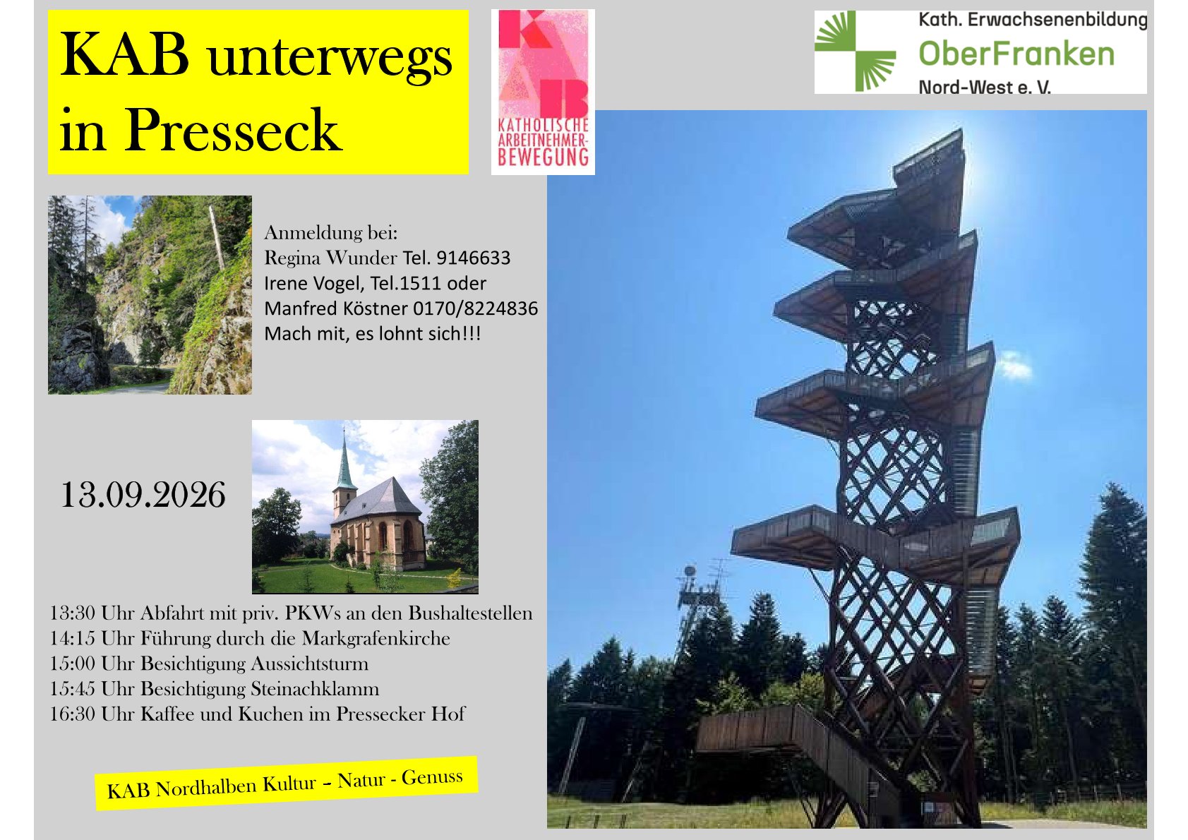 KAB unterwegs in Presseck Am Sonntag, den 13.09.2026 veranstaltet der Ortsverband eine Fahrt "KAB unterwegs" in Presseck. Diese Veranstaltung im iCal-Format speichern KAB unterwegs in Presseck.jpg 13.09.2026 13:30 bis 18:30 Uhr KAB Nordhalben Allgemein