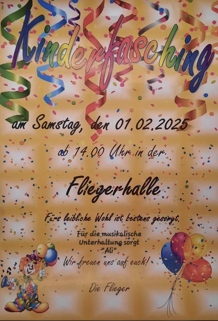 Am Samstag, den 01.02.2025 findet ab 14 Uhr der Kinderfasching des LSC in der Fliegerhalle statt.