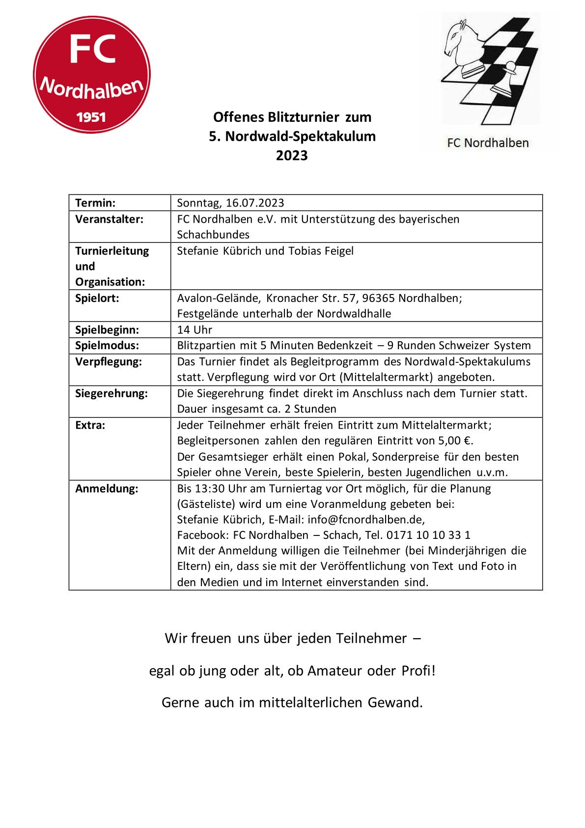 Am Sonntag, den 16.07.2023 findet ab 14:00 Uhr ein Schachturnier auf dem Avalon-Gelände zum 5. Nortwald-Spektakulum statt. Weitere Informationen können Sie untenstehendem Dokument entnehmen.