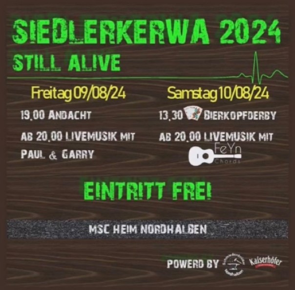 Siedlerkerwa 2024 Am Freitag, den 09.08. und Samstag, den 10.08.2024 findet die Siedlerkerwa veranstaltet von den Schmiedenbrüdern Nordhalben am und im MSC-Heim statt. Diese Veranstaltung im iCal-Format speichern Siedlerkerwa 2024 vom 09.08.2024 bis 10.08.2024 MSC-Heim Wiesenstr. 3 96365 Nordhalben Club der Schmiedenbrüder Nordhalben e.V. Fest