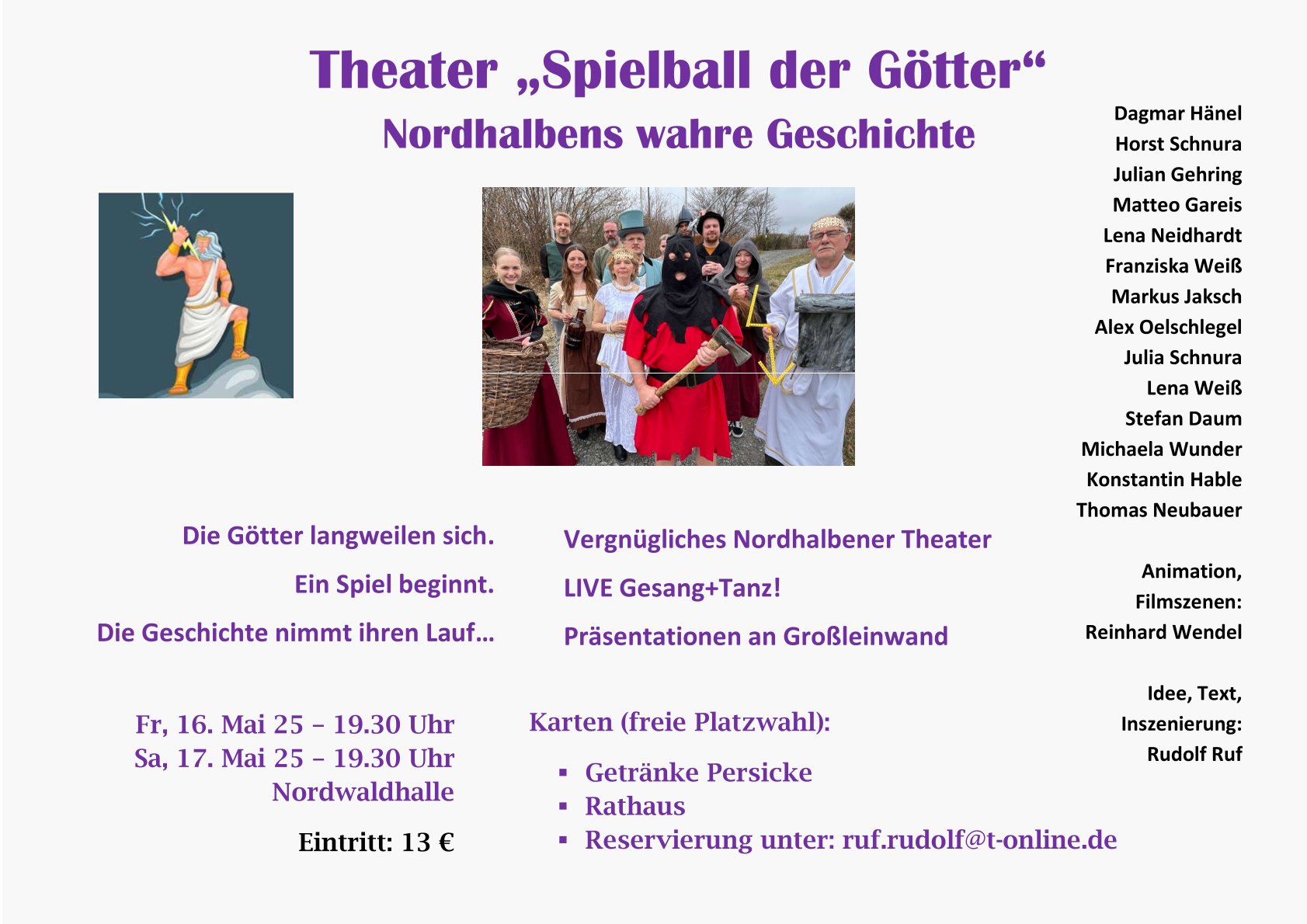 Am Samstag, den 17.05.2025 findet die zweite Vorstellung des Theaters „Nordhalben - Spielball der Götter" in der Nordwaldhalle statt.
