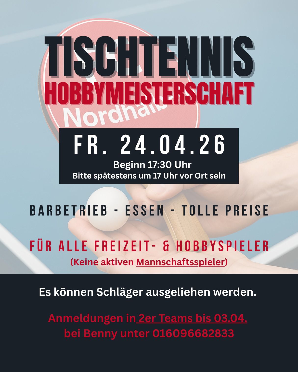 Am Freitag, den 24.04.2026 findet ab 17:30 Uhr die Tischtennis-Hobbymeisterschaft in der Nordwaldhalle statt.